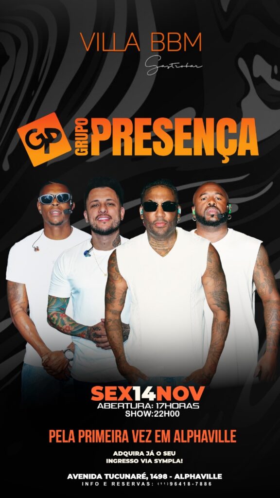 Prepare-se para uma sexta inesquecível na Villa BBM. O Grupo Presença, que vem revolucionando o pagode e conquistando o Brasil com o maior número de streams e ouvintes mensais, se apresenta em um show marcante, cheio de ritmo, carisma e sucessos que todo mundo canta junto.